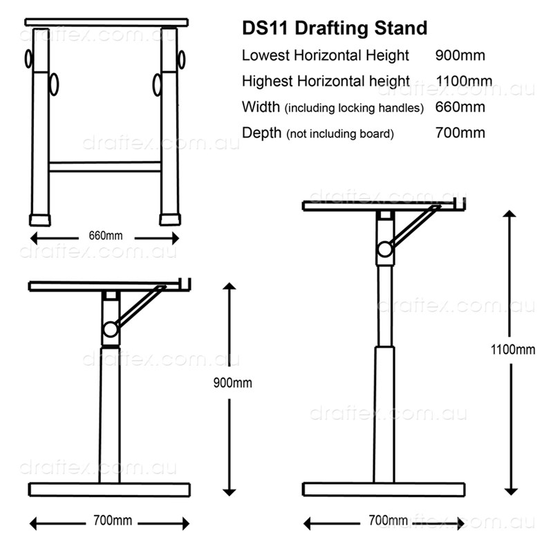 Draftex DS11 Free Standing Drafting Stand includes side locking knobs for angle adjustment, height adjustment and is designed to suit drawing boards sized up to 1200 x 800mm.