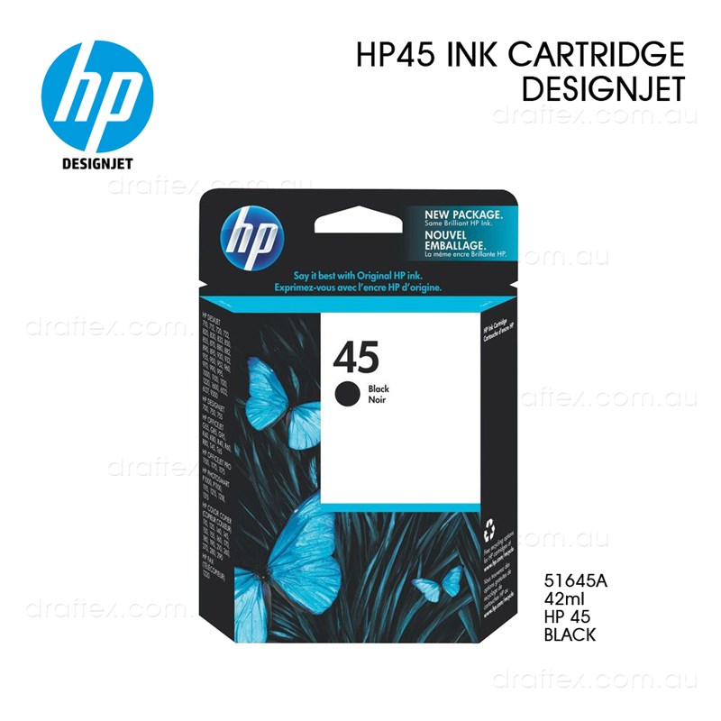 HP 45 Black Inkjet Cartridge 51645A 42ml for printing black text and graphics in crisp, clear and bold appearance consistently with outstanding print quality to suit selective HP wide format inkjet printers.